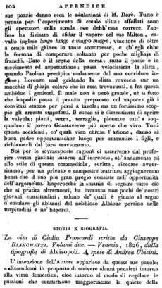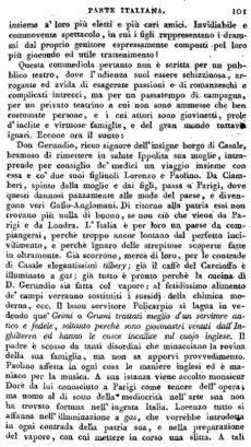 Noi per le sovraesposte ragioni ci asterremo dal proferire verun giudizio intorno all'intreccio, all'andamento ed allo stile di questa commediola, scritta, siccome avvertimmo, per un privato e campestre teatrino; aggiugneremo bensì cha il suo più gran pregio consiste nell'opportunità dell'argomento. Imperocchè la smania di seguire tutto ciò che si pratica oltremonti, ha invasato non pochi de' nostri giovani concittadini; taluno de' quali è giunto al segno d'emulare gli abitanti del nebbioso Albione persino nelle turpitudini e ne' bagordi.
