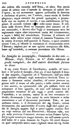 La famiglia in iscompiglio, Commedia in due atti. — Milano, 1826, Pirotta, in 8.° Bella edizione di pochi esemplari, che dall'autore distribuiti furono in dono.