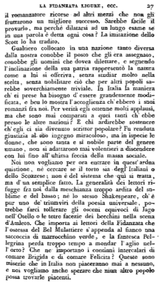 Noi non vogliamo per ora entrare in quest'ardua quistione, nè cercare se il torto sia degl'Italiani o dello Scozzese; non è del sistema che qui si tratta, ma d'un semplice fatto. La generalità dei lettori rifugge fra noi dalla meschianza troppo ardita del sublime e del basso; nè lo stesso Shakespeare, ch'è pur uno de' triumviri della poesia universale, potrebbe farci tollerare gli osceni equivoci di Jago nell'Otello o le tetre facezie dei becchini nella scena d'Amleto. Che importa ai lettori della Fidanzata che l'ostessa del Bel Mulattiere s'appenda al fianco una saccoccia di marrocchino verde, e la fantesca Pellegrina perda troppo tempo a mondar l'aglio nell'orto? Che ne importano i contnui intercalari di comare Brigida e di comare Felicita? Queste sono miserie che in Italia non piaceranno mai a nessuno, e noi vogliamo anche sperare che niun altro popolo possa trovarle piacenti.