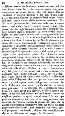 Siffatte parole sembreranno molto severe, ed alcuni forse vorrebbero che venisse usata maggiore indulgenza verso un autore che con tante doti sa riscattare il proprio difetto; e noi più d'ogn'altro a ciò saremmo disposti se potesse farsi senza danno dell'arte, senza danno dello scrittore medesimo. Ma chi saprà penetrare ben addentro nella nostra intenzione, vedrà che questo biasimo stesso è una gran prova che noi apprezziamo altamente l'ingegno che potè dettare questo romanzo. La vera critica non è rigida se non verso coloro che rimangono inferiori aspettazione, e da straniero impedimento si lasciano infiacchire l'intima forza. Noi lo abbiamo detto altrove, e volentieri lo ripetiamo: questo romanziere è chiamato gagliardamente dalla natura a gettarsi nella riaperta carriera, e s'ei non s'arresta per malvagità d'opinioni a mezzo del corso può raccogliere una nobilissima palma. Ma i lodatori sono una pessima razza di nemici, e noi, se pure ci sarà possibile, vogliamo salvarlo da un tanto pericolo. Egli ha imaginato un romanzo dilettevole, ma troppo meglio si doveva sperare da un uomo che avea cominciato colla Sibilla Odaleta, e tosto conoscendo i vizj del genere s'era messo sul verace sentiero. Nè vogliamo dire, come pensano i più, che la Fidanzata ligure abbia da cedere alla Sibilla: molte doti sono nella Fidanzata che nel primo romanzo non erano, e molte pure erano nel primo romanzo che nella Fidanzata non sono. Quello che ne fa essere assai più severi, è lo scorgere che l'imitazione dello Scott s'è fatta ancor più servile, e che l'autore entrato in un più bel campo ne uscì senza trarne un migliore profitto, e quasi non ci mostrò la sua opportuna intenzione che per farne maggiormente increscere di vederla tradita. E poichè ne pare che la natura del romanzo descrittivo non sia forse da tutti conosciuta abbastanza, noi oseremo con tutta brevità proporre, dubitando, alcune idee semplicissime che ci si offersero nel leggere la Fidanzata.