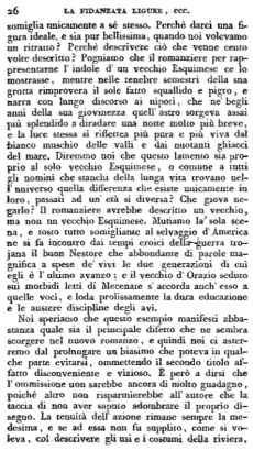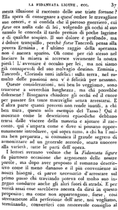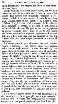 I lettori avranno veduto che la Fidanzata ligure fu piuttosto occasione che argomento delle nostre parole, ma dopo aver proposto il romanzo descrittivo come il meno dannoso e il più conveniente ai nostri bisogni, ci parve necessario d'arrestare sul primo passo chi traviando poteva col molto suo ingegno condurre anche gli altri fuori di strada. E per verità assai cose sarebbero ancora da dirsi in questo proposito; ma come non appartengono, forse, così strettamente alla perfezione dell'arte, noi vogliamo terminando, convertirci con amorevole consiglio al buon romanziere che troppo ne duole d'aver disapprovato finora.