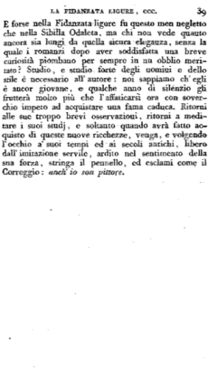 Nè a questo primo studio il nostro romanziere si dee contentare: chè troppo gli manca quel secondo, per cui solo le opere dell imaginazione diventano eterne: tutti comprendono che noi parliam dello stile. E forse nella Fidanzata ligure fu questo men negletto che nella Sibilla Odaleta, ma chi non vede quanto ancora sia lungi da quella sicura eleganza, senza la quale i romanzi dopo aver soddisfatta una breve curiosità piombano per sempre in nn obblio meritato? Studio, e studio forte degli nomini e dello stile è necessario all'autore: noi sappiamo ch'egli è ancor giovane, e qualche anno di silenzio gli frutterà molto più che l'affaticarsi ora con soverchio impeto ad acquistare una fama caduca. Ritorni alle sue troppo brevi osservazioni, ritorni a meditare i suoi studj, e soltanto quando avrà fatto acquisto di queste nuove ricchezze, venga, e volgendo l'occhio a' suoi tempi ed ai secoli antichi, libero dall'imitazione servile, ardito nel sentimento della sua forza, stringa il pennello, ed esclami come il Correggio: anch'io son pittore.