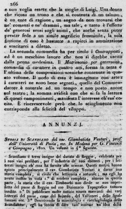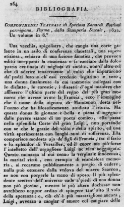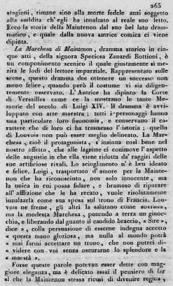 La Marchesa di Maintenon, dramma storico in cinque atti, della signora Speciosa Zanardi Bottioni, è un componimento scenico il quale giustamente si merita le lodi del lettore imparziale. Rappresentato sulle scene, questo dramma dee ottenere un successo non meno felice, quando però il costume vi sia diligentemente osservato. L'Autrice ha dipinto la Corte di Versailles come ce la mostrano le tante Memorie del secolo di Luigi XIV. Il dramma è avviluppato con arte maestra; tutti i personaggi hanno una particolare loro fisionomia, e conservano il carattere che di loro ci ha trasmesso l'istoria; quello di Louvois non può esser meglio delineato. La Marchesa, cioè il protagonista, s'insinua così bene nel nostro affetto, che alle lagrime ci commuove l'aspetto delle angustie in che ella viene ridotta da' raggiri delle sue artificiose rivali. Lo scioglimento n'è ben ideato e felice. Luigi, trasportato d'amore per la Maintenon che ha riconosciuto, non solo innocente, ma la unica di cui si possa fidare, e bramoso di riparare all'afflizione che le ha recato, vuole risolutamente innalzarla come sua sposa sul trono di Francia. Louvois ne freme, gli altri la salutano come sovrana, ma la modesta Marchesa, ponendo a terra un ginocchio, e liberando dal guanto il candido braccio, "Sire", dice, "colla persuasione di esserne indegna accetto questa mano gloriosa, ma nulla al mondo potrà mai farmi accettare un trono, che non potrei dividere con voi senza oscurarne lo splendore e la maestà".