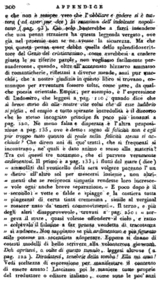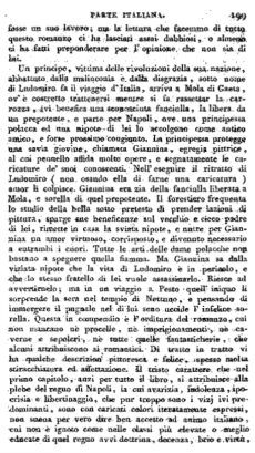 Un principe, vittima dello rivoluzioni della sua nazione, abbattuto dalla malinconia e dalla disgrazia, sotto nome di Ludomiro fa il viaggio d'Italia, arriva a Mola di Gaeta, ov'è costretto a trattenersi mentre si fa rassettar la carrozza, ovi benefica una sconosciuta fanciulla, la libera da un prepotente, e parte per Napoli, ove una principessa polacca ed una nipote di lei lo accolgono come antico amico, e forse prossimo congiunto. La principessa protegge una savia giovine, chiamata Giannina, egregia pittrice, al cui pennello affida molte opere, e segnatamente lo caricature de' suoi conoscenti. Nell'eseguire il ritratto di Ludomiro (non osando ella di farne una caricatura) amor li colpisce. Giannina era zia della fanciulla liberata a Mola, e sorella di quel prepotente. Il forestiero frequenta lo studio della bella sotto pretesto di prender lezioni di pittura, sparge sue beneficenze sul vecchio e cieco padre di lei, rimette in casa la sviata nipote, e nutre per Giannina un amor virtuoso, corrisposto, e divenuto necessario a entrambi i cuori. Tutte le arti delle dame polacche non bastano a spegnere quella fiamma. Ma Giannina sa dalla viziata nipote che la vita di Ludomiro è in pericolo, e che lo stesso fratello di lei vuole assassinarlo. Riesce ad avvertirnelo; ma in un viaggio a Pesto quell'iniquo li sorprende la sera nel tempio di Nettuno, e pensando di immergere il pugnale nel di lui seno uccide l'infelice sorella. Questa in compendio è l'orditura del romanzo, cui non mancano nè procelle, ne imprigionamenti, nè caverne e sepolcri, nè tutte quelle fantasticherie, che alcuni attribuiscono ai romantici. Di tratto in tratto vi ha qualche descrizione pittoresca e felice, spesso molta stiracchiatura ed affettazione. Il tristo carattere che nel primo capitolo, anzi per tutto il libro, si attribuisce alla plebe del regno di Napoli, la cui avarizia, indolenza, ipocrisia e libertinaggio, che pur troppo sono i vizj ivi predominanti, sono con caricati colori iteratamente espressi, non suona per vero dire ben accetto ad animo italiano cui non è ignoto come nelle classi più elevate o meglio educate di quel regno avvi dottrina, decenza, brio e virtù, e che non è sempre vero che l'obbliare e godere si è tuttora (ed esser pur dee) la massima dell'indolente napolitano (pag. 93). Ciò solo basterebbe a farci intendere che una penna straniere ha questa leggenda vergato, ove già nel proemio non se ne avesse la sicurezza. Ma che poi questa penna esser debba quella dello splendido scrittore del Genio del cristianesimo, come avrebbesi a credere giusta le su riferite parole, non vogliano facilmente persuadercene, quando, oltre all'accennato bizzarro ammasso di romanticherie, riflettasi a diverse mende, anzi pur macchie, che a nostro giudizio in questo libro si trovano, comunque per avventura fossero tolte, come pare, da qualche poesia orientale. Empia, per esempio, è l'espressione di Ludomiro, che leggesi a pag. 110, quando dice che sì breve corso dà alle nostre vite colui che di esse ludibrio si piglia, ed empio e tutto spirante incredulita è il discorso che le stesso incognito principe fa poco più innanzi a pag. 120. Nè meno falsa e disperata è l'altra proposizione a pag. 135, ove è detto: sogno di felicità non è egli pur troppo tutto quanto di reale nella felicità stessa si acchiude? Che direm noi di que' tratti, che sì frequenti si incontrapo, ne' quali è dato animo e senso alla materia? Tra cui questi tre notammo, cho ci parvero veramente ardimentosi. Il primo è a pag. 133; i flutti del mare (dice) "ammolliti dal venticello della sera volgere pareano l'un dietro all'altro sol per mescersi insieme, non altrimenti che se reciproca simpatia rendesse loro increscevole ogni anche breve separazione." E poco dopo è il secondo: "vette e falde e spiagge e la costiera tutta pingeansi di certa tinta cremesina, simile al verginal rossore nato da teneri commovimenti". Il terzo, e più degli altri disapprovevole, trovasi a pag. 250: "sorgeva il mare, quasi volesse offendere il cielo, e ratto colpivalo il fulmine a far pronta vendetta di tracotanza sì audace. Non sappiamo se più ardimentoso e più figurato stile potesse un secentista adoperare. Eppure si danno di cotesti modelli di bello scrivere alla volonterosa gioventù. Deh apritevi, o volte di questo tumulo, leggesi altrove (a pag. 122). Diradatevi, tenebrie della tomba! Ella mi ama! Vedi sceltezza di espressione per manifestare il contento di essere amato! Lasciamo poi le maniere tutte proprie del traduttore o editore italiano, come sono le poc'anzi citate tenebrie della tomba, il respiro oppressato (pag. 125), il sonar lieti in sì cara fiducia tutti i giorni (145), e il ripetuto addentrarsi in ogni senso e pensiero e mistero, e che so io di consimile.
