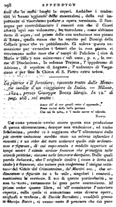 La pittrice e il forestiere; racconto tratto dalle Memorie inedite d'un viaggiatore in Italia. — Milano, 1824, presso Giuseppe Bocca librajo. In 12.° di pag. 268, col motto: