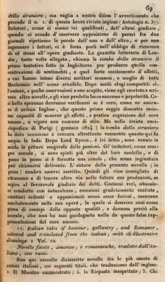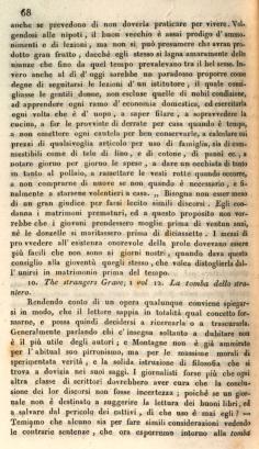 Rendendo conto di un opera qualunque conviene spiegarsi in modo, che il lettore sappia in totalità qual concetto formarne, e possa quindi decidersi a ricercarla o a trascurarla. Generalmente parlando chi c'insegna soltanto a dubitare non è il più utile degli autori; e Montagne non è già ammirato per l'abitual suo pirronismo, ma per le massime morali di sperimentata verità, e la solida istruzione di filosofa che si trova a dovizia nei suoi saggi. I giornalisti forse più che ogni altra classe di scrittori dovrebbero aver cura che la conclusione dei lor discorsi non fosse incertezza; poichè se un giornale non è destinato a suggerire la lettura dei buoni libri, ed a salvare dal pericolo dei cattivi, di che uso è mai egli? — Temiamo che alcuno sia per fare simili considerazioni vedendo le contrarie sentenze, che ora esporremo intorno alla tomba dello straniero; ma vaglia a nostra difesa l'avvertimento che precede il n. I. di questa breve rivista inglese (Antologia n. 37). Relatori, come ci siamo ivi qualificati, dell'altrui giudizio quando ci accade d'osservare opposizione di pareri fra due giornali ripetiamo le parole dell'uno e dell'altro, e per non ingannare i lettori, ci è forza porli nell'obbligo di ricorrere da sè stessi all'opere giudicate. La gazzetta letteraria di Londra, tante volte allegata, chiama la tomba dello straniero il primo tentativo fatto in Inghilterra per produrre quella concentrazione di sentimenti, e quel forte eccitamento d'affetti a cui hanno inteso diversi scrittori scozzesi, e meglio di tutti Mackenzie nell'uomo sensibile. Dopo molti elogi compartiti all'autore, e poche osservazioni a suo scapito, viene egli esortato a scrivere altre novelle, e gli vien predetto buon successo e popolarità. Così belle speranze dovranno verificarsi se è vero, come ne assicura il critico Inglese, che questo primo saggio dimostra insieme capacità di muover gli affetti, e pratica cognizione del core umano, e vigore non comune di stile. Ma nella rivista enciclopedica di Parigi (gennaio 1824) la tomba dello straniero ha dato occasione a censura altrettanto veemente quanto qui fu ampia la lode. Dopo Lord Byron, è ivi detto, sono venute in moda le pitture esagerate delle passioni. Gl'imitatori, come sempre accade, si sono spinti più oltre del loro modello, e di passo in passo si è formata una scuola, che senza ingiustizia può chiamarsi delirante. L'autore della presente novella (in prosa) sembra esservi ascritto. Quindi gli vien consigliato di ritrarsene e di tenere altra via nelle future sue produzioni, se aspira al favorevole giudizio dei dotti. Costumi veri, situazioni condotte con naturalezza, emozioni gradatamente eccitate caratteri ardenti e appassionati senza esser furiosi, mancano assolutamente nella sua opera, la quale si descrive anzi come piena di esempi delle opposte qualità, e dannosa perciò alla morale, che non ha mai guadagnato nulla da queste false rappresentazioni del core umano.