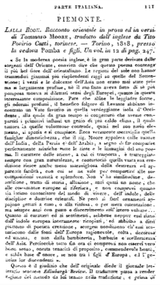 "Se la moderna poesia inglese è in gran parto derivata dalle sorgenti dell'Oriente, convien dire che questo poema contenga il più bel fiore dell'orientalismo. Le regioni del sole non hanno tramandati giammai più risplendenti raggi su quelle del Settentrione; i vezzi e le dolcezze dell'Asia non erano mai state prima sì largamente profuse, nè il suo fasto aveva fatto di sè più pomposa mostra ai dilettati sensi degli Europei, quanto in questa interessante composizione. Pare che alfine le leggiadre forme, gli odorosi profumi, il benefico folgore di Levante abbiano incontrato un Vate favorito in quella verdeggiante isola d'Occidente, alla quale da gran tempo si congetturò che avene compartiti i primitivi influssi un genio di più caldo clima, il quale tuttora in quelle voluttuose contrade, quasi nel suo natio elemento, si spazia e si compiace. Reca veramente meraviglia quella famigliar dimestichezza, che il sig. Moore appalesa colle usanze dell'India, della Persia e dell'Arabia, a segno di far comparire perfettamente asiatiche tutte le tinte e le immagini del suo poema. Il carattere delle sciene, a cui ci trasporta, è tratteggiato sempre con gran naturalezza, e contuttociò quella vasta sua erudizione riesce anche meno maravigliosa della destrezza ed apparente facilità, con cui se ne vale per compartire alle sue composizioni venustà e splendore. Non v'ha similitudine, descrizione, tratto di storia, allusione, anzi quasi un nome, che alle costumanze europee si riferisca, e non comprovi quanto sia intimo conoscitore del modo di vivere, dell'indole, delle discipline e dottrine orientali. Ne però sì fatti ornamenti appajono gettati a caso, o alla rinfusa, o per mera ostentazione, ma sempre anzi con gusto e discernimento sull'intero volume... Quanto ai caratteri ed ai sentimenti, sebbene neppur essi siano dall'indole europea interamente ricopiati, ed abbiano a dirsi piuttosto di poetica creazione, scorgesi nondimeno ch'essi scaturiscono dalle fonti dell'Europa ragionevole, colta, decorosa ed umana, e non dalla bambineria, barbarie e scelleratezza dell'Asia. Perocchè tutto fin ora ci comprova non esservi vero buon senso, onesta tenacità di proposito, commendevole bontà, e salda base d'onore, se non tra i figli d'Europa: ed i genoini lor discendenti".