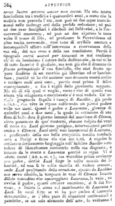 (Se prestiam fede all'epistola dedicatoria promessa dal tipografo a questo dramma, si deve credere il primaticcio letterario frutto d'una Cenomana pastorella, che il terzo lustro ancora ancor non tocca. Ma una tenera fanciulletta tra i tredici e i quattordici anni, a meno che la malizia non preceda l'età, non può nè dee saper tanto innanzi nelle malvage arti della perfida seduzione; nè può nè dee aver famigliari i riboboli del Baldovini, e le Boccaccevoli smancerie, nè può nè dee ripetere le tante volte il nome di Dio, nè profanare la Provvidenza ed altre verità reverende, cose tutte di orribile mestura e incompatibili affatto coll'innocenza e riservatezza della sua età, del suo sesso e della sua condizione. Perciò il tipografo vorrà averci per iscusati se noi crediamo ch'ei sia benissimo l'autore della dedicatoria, in cui vi ha di tutto fuorchè il giudizio, ma non già che il dramma sia frutto primaticcio d'una fanciulla, che anzi frutto appare fradicio di un vecchio già libertino ed or bacchettone, perchè vi ha chi sostiene esso dramma essersi scritto e recitato molt'anni sono, perciò assai prima il felice concepimento, o fra i vagiti della giovinetta supposta. Ma sia di ciò qual si voglia, certo è che di questa cosa ninna più sciagurata e stucchevole s'è mai veduta. Un'orribile gragnuola flagella i campi di Basilio, già prode soldato, che vive in riposo coltivando un piccol podere colle sue mani. Questi è padre a Lauretta, giovane di quindici anni e due mesi, la quale in occasione di una festa di ballo data il giorno innanzi dal marchese di Cloncé, ricco possessore di que' contorni, rimane colpita dai vezzi di certo co. Luzi giovane parigino, intervenutovi perchè amico a Cloncé. Luzi anch'esso innamorasi di Lauretta, e profittando della sua bella semplicità medita condurla seco a Parigi e farne ciò che san tutti. A coprire lo scellerato divisamento largheggia coll'infelice Basilio sotto colore di liberalmente soccorerlo nella sua disgrazia, intanto dà le strette a Lauretta perchè lo segua. Vi si adatta costei (Att. 2. sc. 2), ma vorrebbe prima avvisarne suo padre, sicchè Luzi finge le solite smanie dei libertini, ed essa fa la solita smorfia di cadere svenuta, onde Luzi profittando della occasione, ajutato da Lesbino suo servo ribaldo, la trasporta in casa di Cloncé. Intanto Silvio contadino che amoreggiava Lauretta, la vede, ne avvisa il padre, questi accorre smanioso, si fa del fracasso, e finisce la scena col matrimonio di Lauretta e Luzi. In cotal fatto se vi ha pur ombra d'intreccio drammatico, se l'idea pure di situazioni sentimentali e patetiche, se un solo elemento dell'arte, lo vedranno i lettori. In quanto a noi, quel Basilio, oh! quel Basilio che brontolando ci fa la predica di fra Nastagio, e quel Silvio che ci recita il lamento di Cecco da Varlungo, e que' Cloncé, e que' Luzi che parlan la lingua di fra Guittone, oh! questi propio ci fan perdere la pazienza. Cara pastorella, Cenomana, maschio o femina, vecchia o giovine che vi siate datevi all'ago, ve ne scongiuriamo, datevi al ricamo o al telajo; lasciate i drammi sentimentali al novellier vostro padre, e lasciategli ancora la malinconia che gli frulla nel capo, le sì fatte disconvenevoli tresche, il viso arcigno, l'andarsi ingragnato, e le ciance cha v'han ristucca, per lo calabrone che traforavi il core; da che i grappoli a penzolone, e colui col potatoio, e quell'altro che (parlando di donne) mangia la pere monde, mentre v'ha chi ne annasa la foglie, le sono cose, sapete, che a voi non debbon piacere, e che in un dramma sentimentale non le comportano nemmeno i sedili.