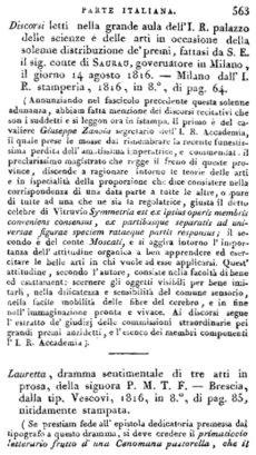 Lauretta, dramma sentimentale di tre atti in prosa, della signora P. M. T. F. — Brescia, dalla tip. Vescovi, 1816, in 8.°, di pag. 85, nitidamente stampata.