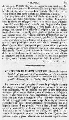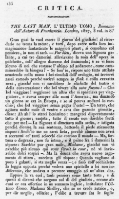 Non neghiamo che l'idea dell'ultimo uomo sulla terra fra la distruzione delle generazioni, sia sì sublime da commovere la mente de' maggiori poeti: e in questo libro v'hanno talora de' brani fortemente ispirati; ma di questa idea farne un romanzo, e in tre volumi, è vera follia. A ciò si aggiunga che questo libro ridonda di scipite o per lo meno inutili descrizioni, e quella della peste si protrae per un intero volume senza che v'abbia neppure un'immagine nuova: non vi sono passioni, non interesse, poichè fra la morte di tutti, che altro si ha a temere od a sperare, fuorchè finalmente l'eroe privilegiato se ne vada ove lo avremo preceduto? Questo libro, per quanti pregi possa offrire, persuaderà sempre non avervi stranezza che non siasi immaginata dall'umana fantasia, che sovente i romanzi sono i sogni della notte di alcune menti esaltate, e che se non offrono le attrattive del bello morale, e quelle di uno stile purgato e terso, sono l'aborto più spregevole della letteratura.