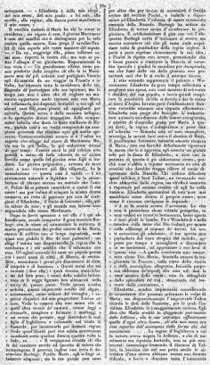 Elisabetta d'Inghilterra invece eclissò colle sue virtù politiche la fama de' migliori re che stringessero lo scettro britannico: ma quella degna figlia di Arrigo VIII, audacissima come il padre, e più avveduta di esso; quella superba virago che, per non dividere la sua possanza, rinunciava per tutta la vita alle dolcezze conjugali e materne, quella invitta spezzatrice di monarchi, quella benefica legislatrice, quell'eroina – nulla avea di grande fuorchè l'ingegno, – il suo cuore era piccolo, arido, volgare. La natura, dandole un cuore spregevole, vendicava tutti gli altri mortali della loro inferiorità di gloria. I posteri l'ammirano; ma niun palpito affettuoso verrà mai destato dalla memoria di Elisabetta.