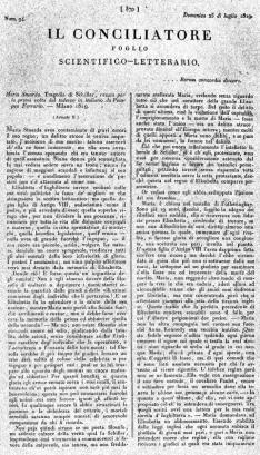 La traduzione del sig. Ferrario è fedele, e si legge con piacere. Ci permetta egli nondimeno di rilevare, come una piccola trascuratezza, facile ad emendarsi, il frequente uso ch'egli fa interrogando della voce cosa? invece di che? o che cosa? Egli può giustificare, senza dubbio, quel suo modo, allegando alcune autorità; ma basta che i migliori nostri scrittori l'abbiano riprovato, perchè ci sembri di doverlo riprovare anche noi. Un altro rimprovero oseremo fare al valente traduttore, e si è di aver dato senza motivo la desinenza italiana ad alcuni nomi stranieri che meglio è lasciar intatti per agevolare ai lettori i riscontri colla storia. Concediamo che invece di Stuart si dica Stuarda, giacchè la celebrità di questo nome così da noi italianizzato renderebbe inopportuno un deviare dall'abitudine; ma perchè se il sig. Ferrario ha detto Leicester, Talbot, Burleigh e non Leicestero, Talbotto, Burleigo, cangia poi egli i nomi di Paulet e d'Aubépine in Paoletto ed Albaspina? Valgano, se non altro, queste lievi censure a dimostrare che nulla di grave abbiamo trovato da criticare in questa traduzione.