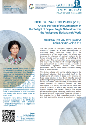 MERLIT researcher Prof. dr. Eva Ulrike Pirker will be giving a lecture on ‘Art and the “Rise of the Meritocracy” in the Twilight of Empire: Fragile Networks across the Anglophone Black Atlantic World’ on Thursday 20 November 2025 at the Goethe University, Frankfurt.