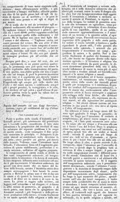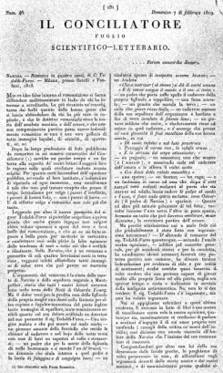 Ma perchè attribuiremo noi a mala fede ciò che probabilmente è stato fatto con ingenuissima intenzione? – D'altronde il romanzo del sig. Tedaldi-Fores quantunque, – secondo l'umile nostra opinione, – infelice pel concetto generale, per gli accidenti storici e per la condotta, ha nondimeno alcuni accessorj lavorati con potenza poetica non comune, ha diverse terzine lodevolissime per evidenza di stile e per verità di sentimenti; sicchè sarebbe quasi temerità il voler credere che una persona capace di giovar molto alla propria fama ed alla patria, voglia ora sprecar tempo e carta e inchiostro in servizio della malignità antiromantica. No, non lo si dee credere. Il sig. Tedaldi-Fores s'è ingannato; ma non ha voluto ingannare.