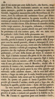 Noi non possiamo produrre alcuna parte di questa novella, perchè le manca il pregio di pudico stile. E neppure non ha morali precetti, idonei a deturpare il vizio. S'innamorano i due giovani, tratti solo alla bellezza della persona. Astuzia e voluttà gli congiunge. Mai non si ode un pensiero che dia vaghezza all'animo. Sopraggiungono impedimenti, e l'arte della donna gli vince. L'amatore è vile. Egli è battuto innanzi alla porta di lei che adora, e le battiture riceve avvolto nel suo capuccio. Egli è tratto come fosse ladro in carcere, soffre la corda, fugge, e fa voto di non più andare a casa di Marsilia; sicchè ella è costretta di venire a lui, insultando amendue gli uomini e gli dei. In un solo punto piace la sua viltà: quando egli entrando nelle adultere stanze, ode la voce dell'offeso marito, e fugge via ratto per le scale, benchè possa godere i desiati amplessi tutto sicuro per la stupidezza del di lui rivale. In questo sol punto ei lascia il proibito frutto perchè gli rimorde l'animo; simile però a lupo che abbandona le agnelle, poichè sente i fischi del loro pastore.