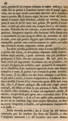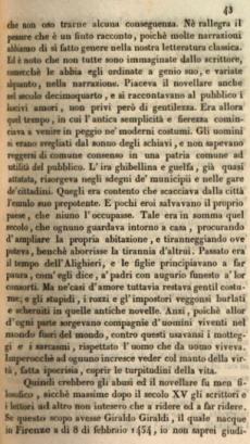 Quindi crebbero gli abusi ed il novellare fu men filosofico, sicchè massime dopo il secolo XV gli scrittori e i lettori ad altro non intesero che a ridere ed a far ridere. Se questo scopo avesse Giraldo Giraldi, il quale nacque in Firenze a di 8 di febbraio 1454, io non saprei giudicare, poichè di lui rimane soltanto la sopra indicata novella. Ed in questa è l'amatore invero uno di quegl'ippocriti, che in ogni secolo sono stati aborriti: ed è condannato e punito. Ma il danno sopra lui non viene da' tradimenti d'amore. Egli desidera, chiede ed ottiene, senza pure il caso di dover esser mai geloso. Nè questa è sventura: e tutti gli altri mali son sempre lievi a chi riamato ama. Volendo far lui ridicolo, come sarebbe stato opportuno, bisognava esporlo alle derisioni della donna sua e contristarlo ne' suoi proprii affetti. In iscambio di che si nota, aver egli potuto fuggire ogni infortunio, e goder tranquillo poichè non sentiva rimorsi in petto, se colla rea coscienza avesse congiunto animo prode.