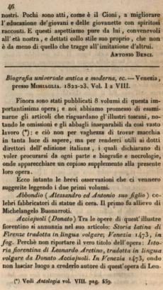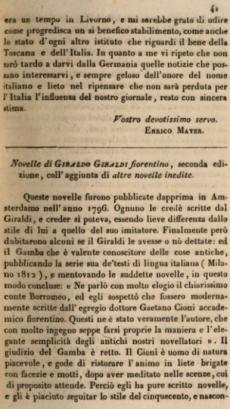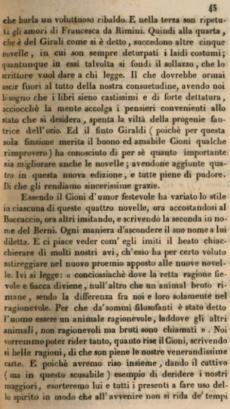 Nella seconda novella (che il Cioni ha nel mezzo interrotta per far credere che fosse del Giraldi, e che l'originale mancasse) è all'incontro una casta donna che burla un voluttuoso ribaldo. E nella terza son ripetuti gli amori di Francesca da Rimini. Quindi alla quarta, che è del Girali come si è detto, succedono altre cinque novelle, in cui son sempre deturpati i laidi costumi; quantunque in essi talvolta si fondi il sollazzo, che lo scrittore vuol dare a chi legge. Il che dovrebbe ormai uscir fuori al tutto della nostra consuetudine, avendo noi bisogno che i libri sieno castissimi e di forte dettatura, acciocchè la mente accolga i pensieri convenienti allo stato che si desidera, spenta la viltà della progenie fautrice dell'ozio. Ed il finto Giraldi (poichè per questa sola finzione merita il buono ed amabile Cioni qualche rimprovero) ha conosciuto di per sè quanto importante sia migliorare anche le novelle; avendone aggiunte quatro in questa nuova edizione, e tutte piene di pudore. Di che gli rendiamo sincerissime grazie.