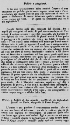 L'amore è una passione sì comunemente sentita, che da sè sola non basta ad interessarci per chi la sostiene, giacchè gli uomini non sogliono nè compiangere, nè ammirare quelle cose che hanno ogni giorno sott'occhio. Egli è perciò che dei cento romanzi i novanta almeno ti agghiacciano il cuore mentre favellano di focosi sospiri: perocchè molti scrittori possono saper fingere un protagonista innamorato, ma pochi sono capaci d'infondervi una qualche passione più generosa e più maschia che traendoci a venerarlo siccome uomo diverso dall'universale, ci renda care le sue passioni e le sue sventure. – Pare che così la pensasse anche il sig. Sacchi, poichè studiossi di dare al suo Evardo un'anima più passionata delle ordinarie, a di farlo apparire non men sollecito della patria e della gloria, che innamorato di Oriele. Ma queste due passioni della patria e della gloria non si possono attribuire a qualsiasi personaggio introdotto in un romanzo, non ponno essere esagerate a volontà dello scrittore, e guai se in ciò le parole sono soverchie all'idea che il leggitore si forma del protagonista. Guai se vi sospetta qualche fine particolare ed interessato dello scrittore. Cessa allora tutta l'illusione del romanzo e il cuore del leggitore si raffredda per dar luogo alla ragione che ne giudica e pesa le parole non più come espressioni di un uomo appassionato, ma come il vero pensare dell'autore. E questo Evardo quale opinione ci desta di sè? Egli è giovine assai: da pochi anni vive in Italia, e quivi è innamorato, geloso, e geloso pazzamente. Vero è che parla frequente di patria, ma noi osiamo dire che secondo giovane fuggitivo a cui lo vicende politiche tolsero la patria e i parenti, e secondo eroe di romanzo, egli è in questo proposito assai freddo. Parla egli mai di suo padre? Resta dunque in Evardo principale a diremmo quasi unica passione l'amore di Oriele, val quanto dire, vi resta una passione che ha mestieri di un grado ben eminente di forza o di gentilezza per acquistarsi l'attenzione de' leggitori. A voler conchiudere se questi caratteri si trovino nell'amore di Evardo bisognerebbe considerarne a parte a parte il nascimento e i progressi: ma perchè ciò n'è tolto dalla brevità di un articolo, ci accontenteremo in generale di osservare che dove gli effetti possan parere sproporzionati alla forza della passione, anzi che moverci a compatimento, ci fan parer vile colui che non sa sostenerle da uomo: e che quando non vuolsi evitare il brutto esempio d'un suicidio bisogna almeno farlo nascere da uns passione che in qualche maniera lo valga. Ma Evardo non ti ha parlato ancora di patria, non ti ha dato ancora indizio di animo forte, di veementi passioni, e propone di volersi uccidere per ciò solo che non si tiene amato da Oriele. È questa dunque una tale sventura che obblighi il lettore a perdonargli un sì disperato proponimento? Del resto non era da presumere sì facilmente che molti possan durare per 550 pagine ad esser commossi da un racconto amoroso, e noi crediamo di poter asserire che neppur l'autore ebbe l'animo capace di sì lunga passione, onde talvolta si curò celarne collo studio delle parole il difetto, e non di rado esce in digressioni troppo lontane dall'argomento e troppo fredde per essere poste in bocca di un eroe da romanzo. Del primo caso servono di esempio le lettere X e XIX nelle quali Evardo ringrazia Oriele di avergli scritto che lo ama, e parla del primo bacio con queste parole veramente fredde e puerili: Celeste Oriele, anima impareggiabile, asilo delle grazie, ara, trono, sede d'amore… Ah Oriele, amabile, tenera, divina Oriele... Oh divina potenza d'amore, oh Dio scuotitor dell'universo, ed è possibile consenti ai mortali tanto bene sulla terra? Ed oseranno ancora questi stolti invidiare la sorte dei numi? Ed in quanto poi alle digressioni rimettiamo il leggitore alla lettera XXXIX dove si parla di matrimonio; alla XLVI che ci parve una debole imitazione dell'ode a Silvia di Parini; e più ancora alla XVI della parte seconda ove il nostro protagonista volendo toccare la questione attuale della lingua, propone un amfizionato di tutti i letterati d'Italia onde intendere all'importante lavoro, e soggiunge poi: Accadrebbero de' gran rumori, ma intanto la faccenda andrebbe alla fine: si strapazzino pure, e se la capita, rinnovino anche la guerra de' breviarj col sunto codice della lingua, che già in fine non resterebbe morto nessuno e si verrebbe a capo di qualche cosa: l'indegnità delle quali parole a mille doppi s'accresce veggendole vicine ai nomi di que' due chiarissimi ingegni che con sommo amore e sapere s'adoperano al perfezionamento dell'italiana favella. Se non che questo giovane si piace anche altrove di morder la fama dei dotti, e fa, al parer nostro, vera scortesia, dopo averne qua e là nominati alcuni da lui conosciuti in Milano, il dire che nessun letterato di questa città fa olocausto del cuore alle virtù morali. – Per ultimo resterebbe a parlare dello stile, e noteremmo di buona voglia alcuni difetti se non temessimo di sentirci all'orecchio que' versi: