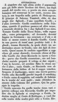 È singolare che egli abbia scelto l'argomento non già dalle storie favolose dei Greci, ma dagli annali del medio evo, e poscia sia stato scrupolosissimo nel conservar le tre unità, mentre dettava la sua tragedia nella patria di Shakespeare. Il principe di Salerno Tancredi ebbe da due mogli due figliuoli, l'uno appellato Guelfo, e l'altro Averardo. Guelfo combatteva nella Palestina, quando il genitore passava ad altre nozze, e morendo divideva fra i due figliuoli il suo stato. Tornato Guelfo dalla Terra Santa, volle regnar solo, come primogenito; ed Averardo dovette fuggire in Germania: ma cresciuto e d'età e di forze si mosse contro il fratello Guelfo. Costui in una guerra di trent'anni perdette tutti i figliuoli, tranne Ricciarda, la quale destò un ardentissimo amore in Guido, uno dei figli di Averardo. Quest'amore fu creduto opportuno a conciliare gli animi discordi; Averardo chiese al fratello Guelfo che desse Ricciarda in isposa a Guido: parve che Guelfo consentisse, ma nel banchetto nuziale preparò il veleno ai due nipoti: l'uno lo bevette, ed avrebbe fatto lo stesso anche l'altro, ossia Guido, se Ricciarda non allontanava dalle labbra di lui il nappo venefico. Scoperto il tradimento, nasce una nuova guerra; Guelfo odia Ricciarda perchè impedì il veneficio; e Guido entra di soppiatto nel castello di Salerno fra le tombe de' suoi padri, onde difendere la amante dalla violenza del genitore. Qui ha principio la tragedia.