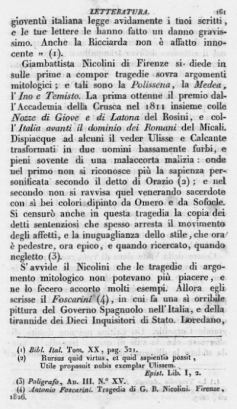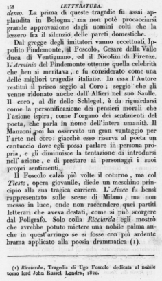 Il Foscolo calzò più volte il coturno, ma col Tieste, opera giovanile, diede un meschino principio alla sua tragica carriera. L'Aiace fu bensì rappresentato sulle scene di Milano, ma non messo in luce, onde non raccendere quei partiti letterari che aveva destati, come si può scorgere dal Poligrafo. Solo colla Ricciarda egli mostrò che avrebbe potuto mietere una nobile palma anche in quest'arringo se si fosse con più ardente brama applicato alla poesia drammatica (I).