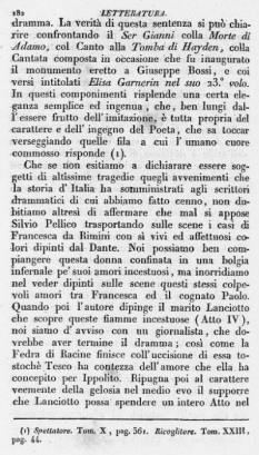 Che se non esitiamo a dichiarare essere soggetti di altissime tragedie quegli avvenimenti che la storia d'Italia ha somministrati agli scrittori drammatici di cui abbiamo fatto cenno, non dubitiamo altresì di affermare che mal si appose Silvio Pellico trasportando sulle scene i casi di Francesca da Rimini con sì vivi ed affettuosi colori dipinti dal Dante. Noi possiamo ben compiangere questa donna confinata in una bolgia infernale pe' suoi amori incestuosi, ma inorridiamo nel veder dipinti sulle scene questi stessi colpevoli amori tra Francesca ed il cognato Paolo. Quando poi l'autore dipinge il marito Lanciotto che scopre queste fiamme incestuose (Atto IV), noi siamo d'avviso con un giornalista, che dovrebbe aver termine il dramma; così come la Fedra di Racine finisce coll'uccisione di essa tostochè Teseo ha contezza dell'amore che ella ha concepito per Ippolito. Ripugna poi al carattere veemente della gelosia nel medio evo il supporre che Lanciotto possa spendere un intero Atto nel garrire; che in mezzo all'onta ed allo sdegno si contenti di lasciar partire Francesca; e che tenga il fratello e rivale Paolo circondato dalle guardie perchè non possa più rivedere Francesca. Aggiungasi, dice il citato Critico, che il magnanimo ed affettuoso carattere di Paolo, quello così tenero, così amabile di Francesca, congiunti alla propensione che si ha per gli amanti, fanno sì che in quest'Atto lo spettatore si commova in lor favore, ad onta che sieno colpevoli, e prenda viva pietà di essi, mirando quasi di mal occhio il marito Lanciotto (I). Nè più avventuroso ci parve il Pellico nella scelta dell'argomento di un'altra tragedia intitolata Eufemio di Messina. È questo il nome di quello sciagurato Siciliano che chiamò i Saraceni nella patria sua isola, e fu causa che si piantasse in vicinanza dell'Etna il vessillo della Luna crescente. Molti però sono i pregi tanto di stile quanto di concetti che risplendono nella Francesca e nell'Eufemio.