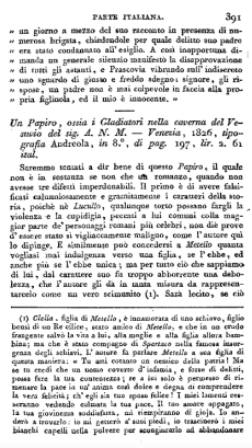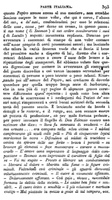 Saremmo tentati a dir bene di questo Papiro, il quale non è in sostanza se non che un romanzo, quando non avesse tre difetti imperdonabili. Il primo è di avere falsificati calunniosamente e gratuitamente i caratteri della storia, poichè nè Lucullo, qualunque torto possano fargli la violenza e la cupidigia, peccati a lui comuni colla maggior parte de' personaggi romani più celebri, non diè prove d'essere stato sì vigliaccamente maligno, come l'autore qui lo dipinge. E similmente può concedersi a Metello quanta vogliasi mai indulgenza verso una figlia, se l'ebbe, ed anche più se l'ebbe unica; ma per tutto ciò che sappiamo di lui, dal carattere suo fu troppo abborrente una debolezza, che l'autore gli dà in tanta misura da rappresentarcelo como un vero scimunito (I). Sara lecito, se ciò vuolsi, fondare de romanzi sopra nomi storici; ma non alterare di siffatta maniera il carattere d'uomini eminentemente illustrati dalla storia. Il secondo difetto consiste nel non vedersi in questo o papiro o romanzo conservata la convenienza de' costumi, del tempo e del popolo, a cui l'autore suppone pertinenti i suoi personaggi. Egli confonde gli usi e la civiltà romana de' tempi poco anteriori alla dominazione di Cesare cogli usi e colla civiltà de' tempi nostri. Delle quali cose facilmente si convincerà chiunque legga questo romanzo o Papiro, per poca attenzione che vi metta. Il terzo difetto sta nella scandalosa violazione di ogni più volgare convenienza della lingua italiana. Nè vogliamo qui alludere a certe o scorrezioni o difformità di voci, le quali nello stato generale della nostra coltura dovrebbero ormai andare a carico de' correttori delle stampe, anzichè degli scrittori; dappoichè nulla è più facile quanto che questi tutt'intesi a dettare ciò che la eccitata immaginazione loro inspira, non badino troppo alla minutezza della locuzione, gl'inesatti modi della quale possono senza molta pena togliersi alla semplice lettura di ogni scritto. Di queste scorrezioni e difformità abbonda cotesto Papiro. [...] Ritornando poi all'autore del Papiro, noi crediamo di doverlo querelare per quella troppo lunga serie di barbarismi, che in non più di 197 pagine di alquanto grosso carattere difformano quest'operetta: i quali sono ben altra cosa che le scorrezioni e i neologismi dai Puristi de' nostri tempi rimproverati a certi buoni scrittori della seconda metà del passato secolo. [...]